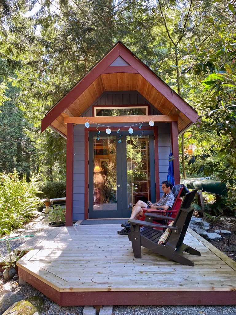 Of all my early rental days, I was never happier than when I had what’s called here in Quebec a 1 1/2 apartment—one room plus a bathroom. I remember carrying box after box of stuff on my bicycle handlebars to the Salvation Army store as I downsized. I had a large Williamsburg faux colonial pottery mug that contained all my cutlery, no oven but just a hotplate, a kitchen table with fold-down leaves, and a wardrobe for all my clothes. I knew the precise location of every single item in my possession. Once when I loaned the apartment to some friends, they phoned me to inquire where something was. “Yeah, if you look under the sink to the right in a plastic container . . . ” Life was simple; I didn’t even have a TV then. So I get the appeal of a tiny house. My current house is not tiny but small, and my next house will be small too. As Ennis of Brokeback Mountain says, “If you got nothing, you don’t need nothing.” It was a joy to spend a night in a tiny house at Roberts Creek.