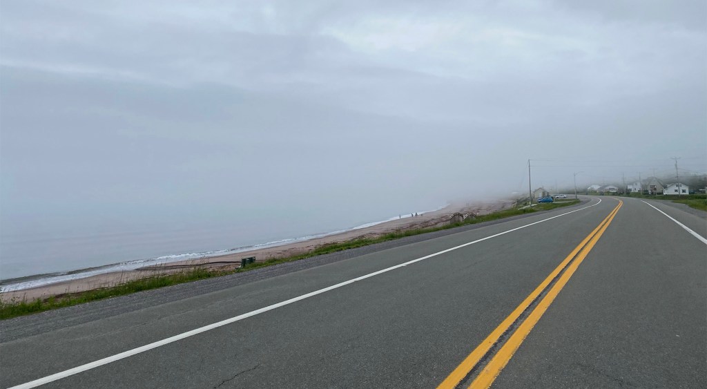 We couldn’t afford to stay long in Percé. After picking up my pannier sticker, we continued on. The coastline now heading back west is sandy beaches with a smattering of homes along the road. Marilyn was surprised that the area is so populated, but geography determines a lot, and here fishing boats can safely land compared to the rocky shore of the gulf coastline. Instead of the adrenaline of the twisty, undulating road earlier, I was happy to cruise the Baie-de-Chaleurs, past the small fishing villages of Grand-Rivière, Chandler, Port-Daniel, Paspébiac, and Bonaventure. By the time we reached New Carlisle and New Richmond, the place-names indicated we were approaching New Brunswick.