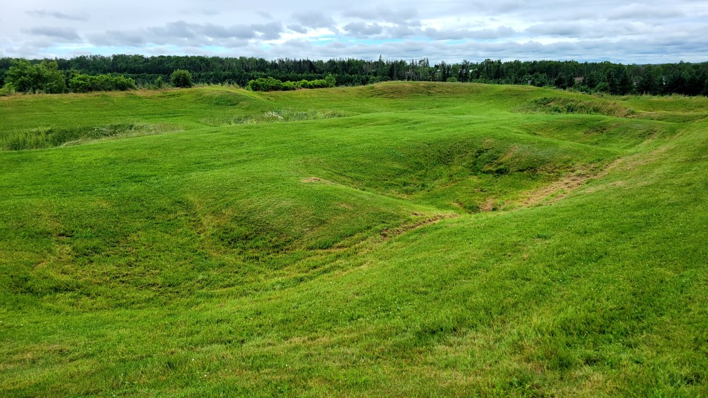 A little more exploring as we headed north brought us to Skmaqn–Port-la-Joye–Fort Amherst National Historic Site, which tries to recognize in its name every group that has once laid claim to it: the Indigenous Peoples, the French, and the English. Today it’s occupied by Canadians, and specifically, me. I walked the trail while Marilyn took a break up at the welcome centre. You can see the ruins of two forts, the older being the French; the newer, the English, and a monument describing The Grand Dérangement.