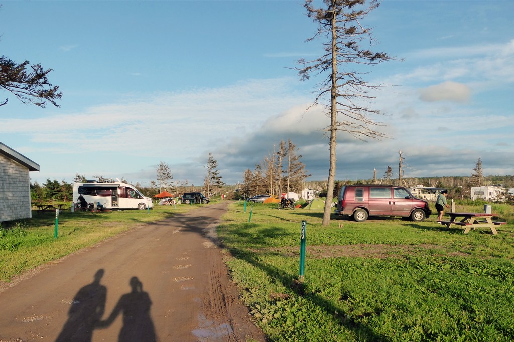 It’s unfortunate that the first thing you see upon entering the island is a commercial complex at the base of the bridge, but it had a Tourist Info Centre and, more importantly, a liquor store. While I was stocking up on campsite refreshments, Marilyn was talking to the nice young lady at the Info Centre and discovering that my plan to ride the perimeter of the island in one day was a bit . . . ambitious. I’d read in our travel guide that it’s a 350 km. loop, but apparently that is just the central region. We abandoned our plan to get over to Cedar Dunes Provincial Park on the western tip of the island for sunset and, instead, camp at Cavendish Campground in Prince Edward Island National Park on the northern shore. That seemed more doable and left us time to explore some of the shoreline in search of those red clay cliffs.