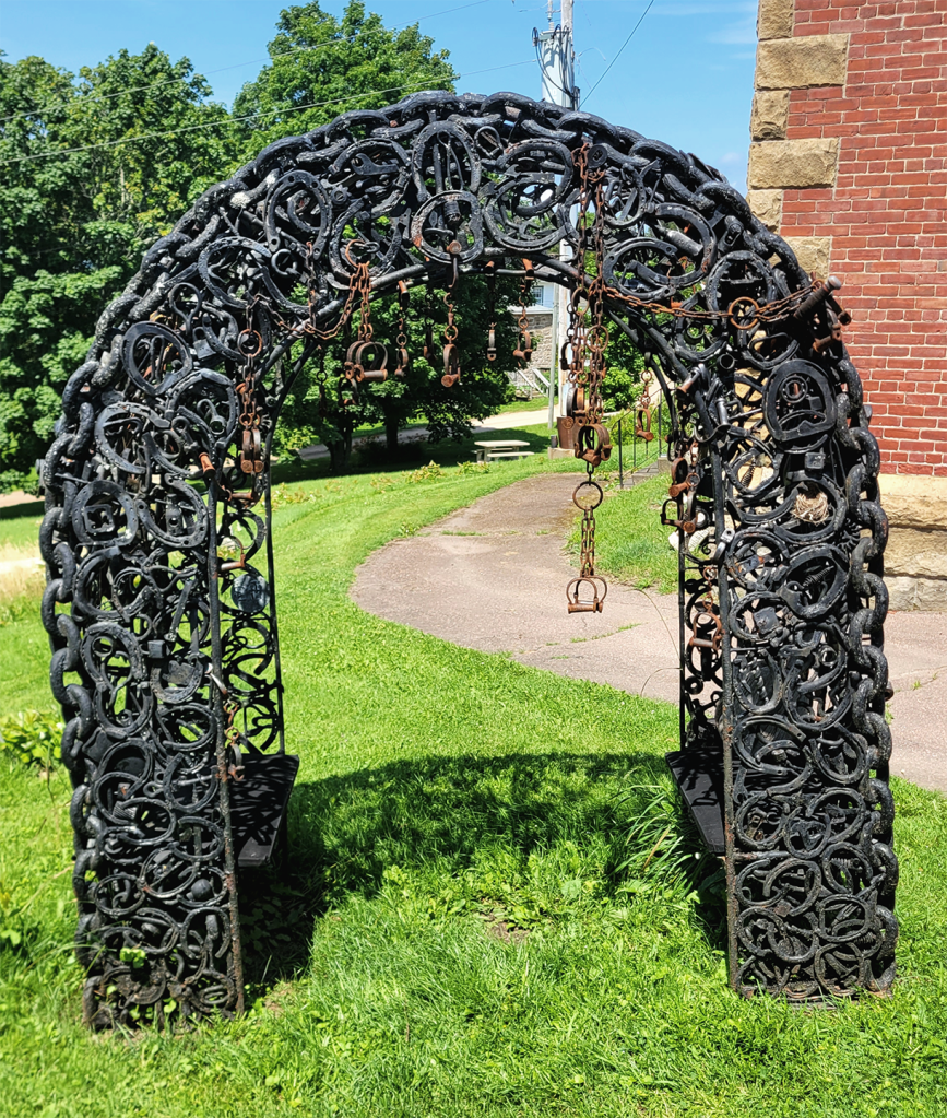 Also of interest was this metal arch that was constructed from horseshoes, locks, car parts, tools, chains, and prisoner shackles. And amid it all—I don’t know if built or placed—was a bird’s nest.
