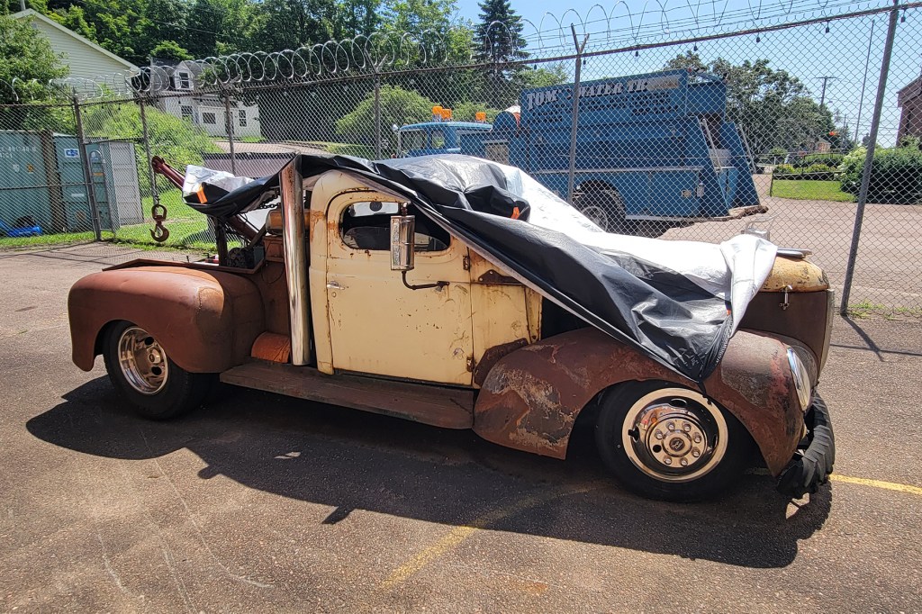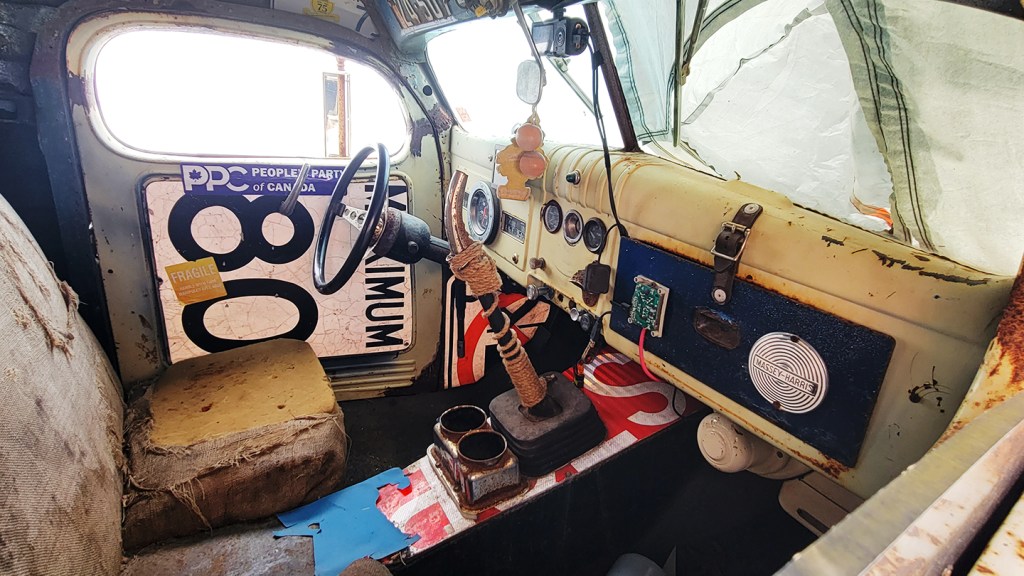 This bad girl (the truck, not the woman, who graciously lifted the cover to show me) had a bit more rust on her than the Bricklin. Love the tractor tire front bumper, almost as good as the Bricklin’s featured “energy-absorbing” bumpers.
