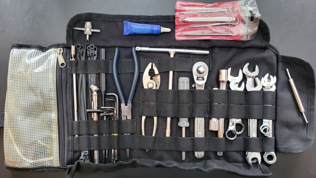 In a Dollar Store pencil case, I have my sockets, some hex bit sockets (3/8″ and 1/4″ stubbies), an elbow socket, spark plug socket, a couple of crowfoot sockets (again, particular to my bike), a spoke wrench, and said vice grips (aka locking pliers). I used to carry torx bits with the BMW, but since switching to Triumph, I now carry hex bits.