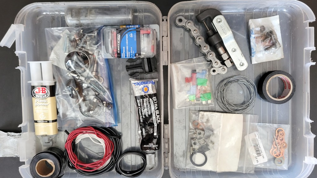 In one of my panniers, I carry a plastic box that contains other items and spare parts (see image at top). The spare parts have gone with the sold BMW so need to be replenished, but they were a spare clutch cable, spare levers, and a spare water pump. If I were doing a RTW tour, I’d carry more spare parts than this, but so far my tours have been in North America, where parts are readily available.