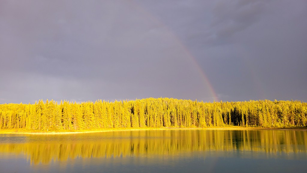 I also experienced in Northern BC the third and final rain shower of the six-week tour, it was that hot and dry all summer. I did “only” 616 kilometres that day and found a spot for the night at Inga Lake Provincial Park. There I met Jeremy and Samoyed, Rory, travelling in a converted camper van. Like Mountain Man Mike I had met in Yukon, travelling by converted van or truck seems to be a very popular choice these days. Gas is cheaper than with a full RV, it’s easier to get around, and most have a small kitchenette and bed. Walter and I ended up sharing a drink and watching the meteor shower together that night.